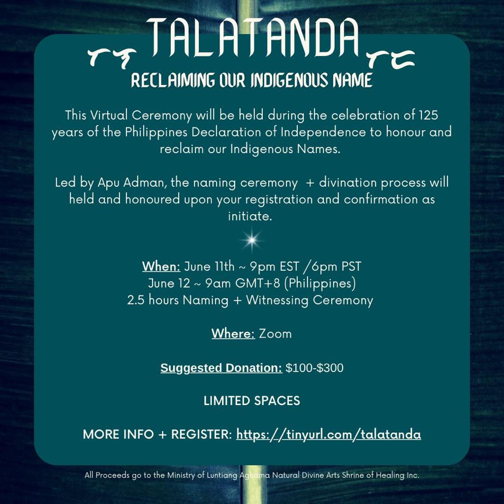 Through this the Shrine of Luntiang Aghama is offering a Path towards Liberation, a means to cut off our selves from the terror of the past and a Blessings from our Indigenous Ancestors by having our own Filipino name through Bansagan Ritual of Tala Tanda.