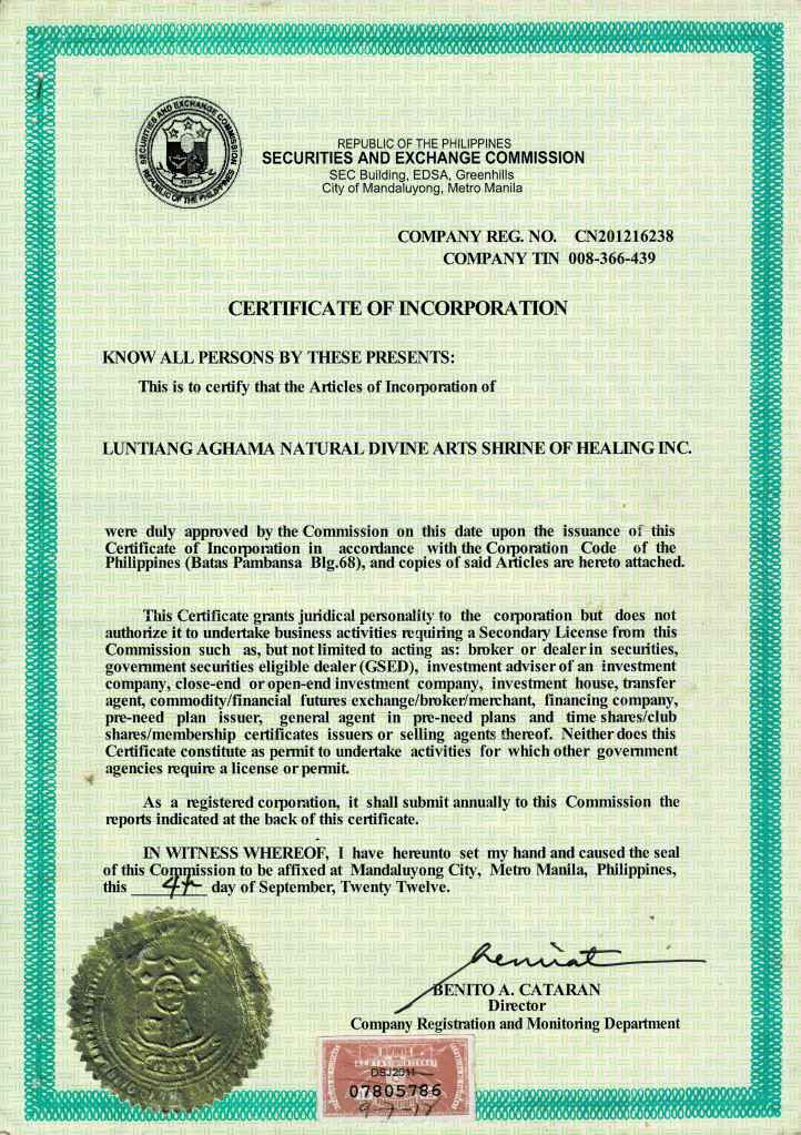 I just recently heard this controversy through Lakay while he is talking to me last night while I am here in California. This caught my interest because the 4th of September is our Incorporation Day, which we celebrate our Philippine Government Recognition as a Religious Organization. It was 12 years ago when we registered our small Shrine as a Religious Organization and from that day on September 4, 2012, we have received our Certificate of Incorporation that gives us our Juridical Personality. This means Luntiang Aghama Natural Divine Arts Shrine of Healing Inc., just like any Filipino Citizens have its exclusive rights and obligations under the law. This certificate makes us Celebrate the Freedom of Religion in the Philippines.
