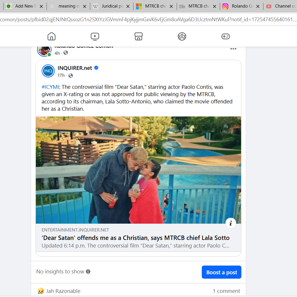 But unfortunately, this day, as I open up my Facebook, I saw an article about a film titled “Dear Satan” that received an X- Ratings because it offends the Religious Feelings of the Movie and Television Review Classification Board Chairperson Lala Sotto and said that it violated the Presidential Decree No. 1986 that establishes the Movie and Television Review Classification Board (MTRCB).