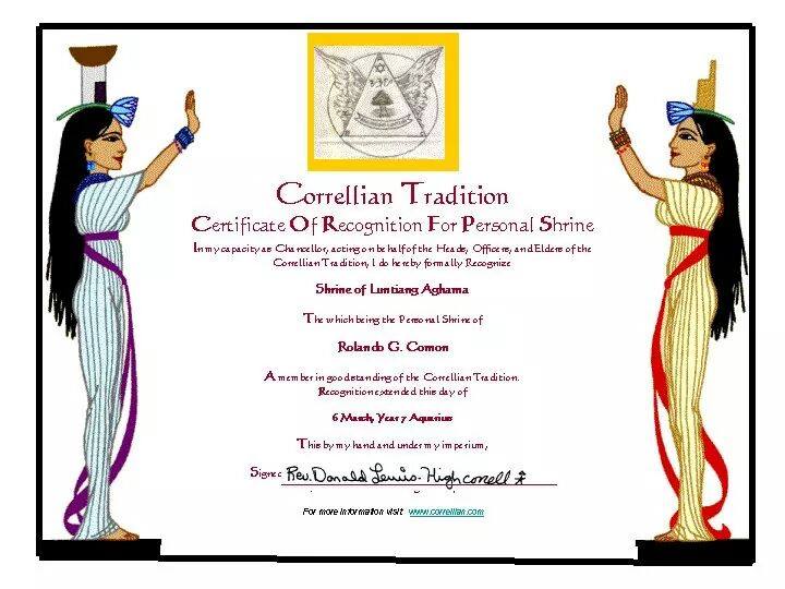 We are established/ founded on December 13, 2000 as a personal and outward expression of Faith by its founder and on its philosophy that states: “The Wisdom of God gave knowledge to men; and the wisdom of Men is to know God” Thus the nature and purpose of the Shrine is about the KNOWLEDGE OF GOD. It also shares and adopts the Principles and Philosophies of the CORRELLIAN WICCA. The Shrine obtained its Certificate of Incorporation as Religious Corporation Sole issued by the Philippines Security and Exchange Commission on September 4, 2012. We obtain first our Certificate of Recognition as a Personal Shrine of the Correllian Nativist Tradition of Wicca on 6th of March 2007 and on the 17th of December 2014 we received our Charter as a Formal Correllian Wiccan Shrine in the Philippines.